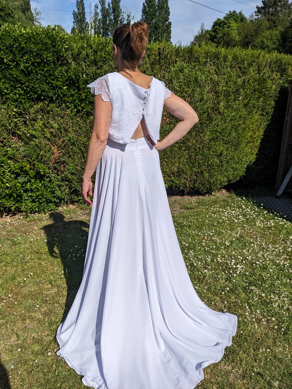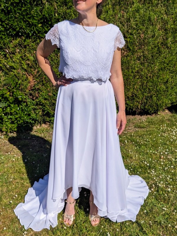 Robe deux pièces, avec une jupe asymétrique en mousseline de soie et un haut effet dentelle à manches courtes. Petite ouverture dans le dos.
