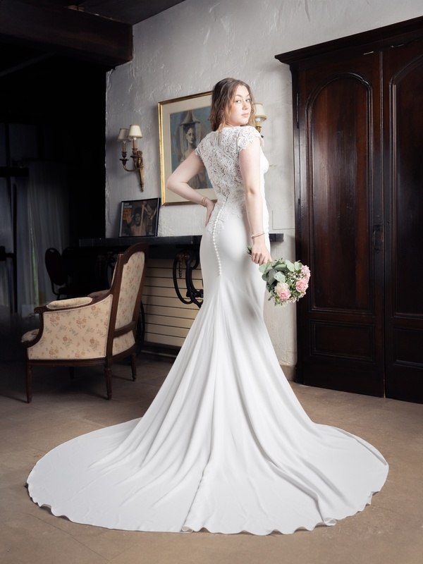 Son haut est entièrement composé de dentelle guipure; le décolleté en V devant lui donne un charme romantique confirmé par le dos bateau. Elle se ferme grâce à une fermeture éclair et un système de boutons.