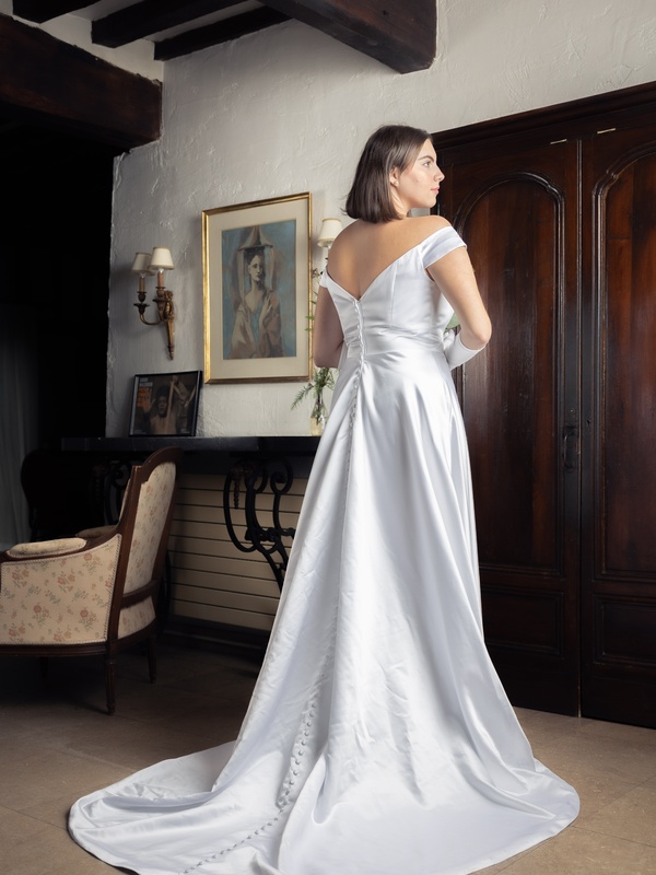 Son col bardot, sa taille empire et sa traîne de presque qu’un mètre font toute la beauté de cette robe de mariée. Le col plongeant dans le dos lui confère un petit côté sexy, tout en élégance.