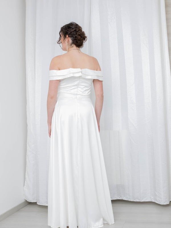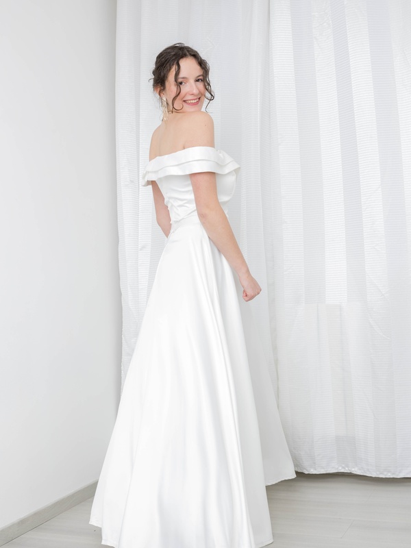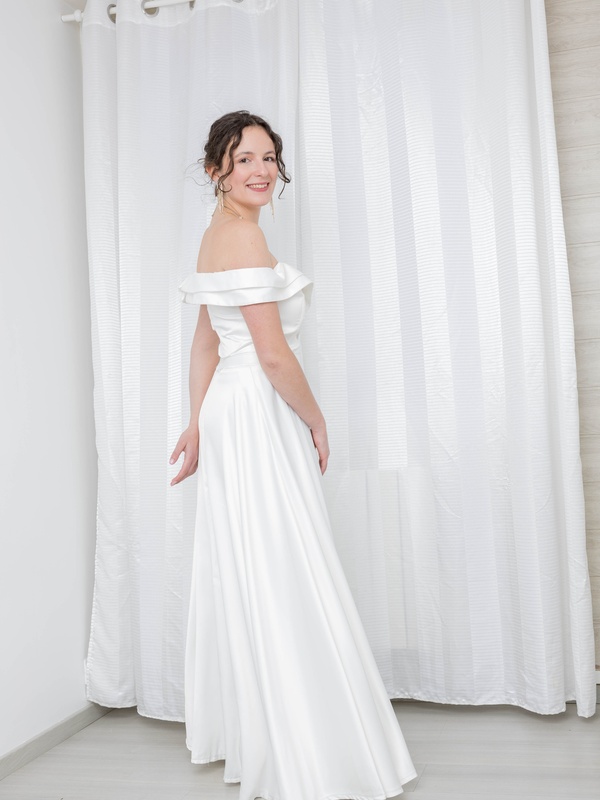 Découvrez Lara, notre magnifique robe de mariée avec sa coupe empire et son col Bardot croisé devant.
