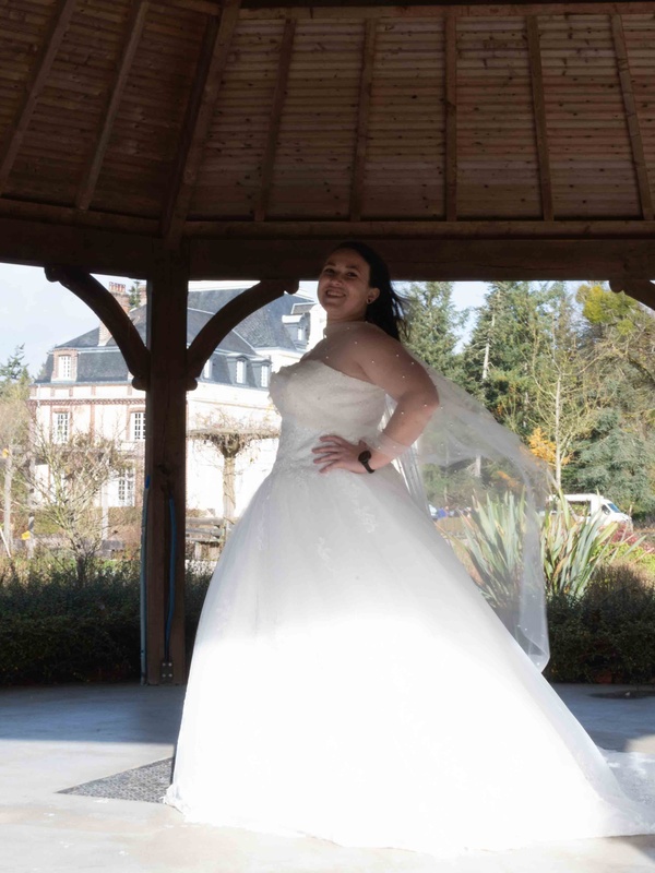 La jupe en mousseline recouverte d’un tulle brodé et la longue traîne d’un mètre donne un effet princesse à cette robe.