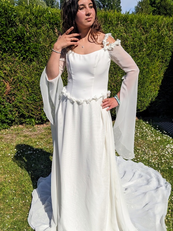 Robe de coupe empire, avec une traîne de taille moyenne. Robe recouverte de mousseline de soie, manches larges de type renaissance. Détails fleuris sur les épaules et à la taille. Zip dans le dos.