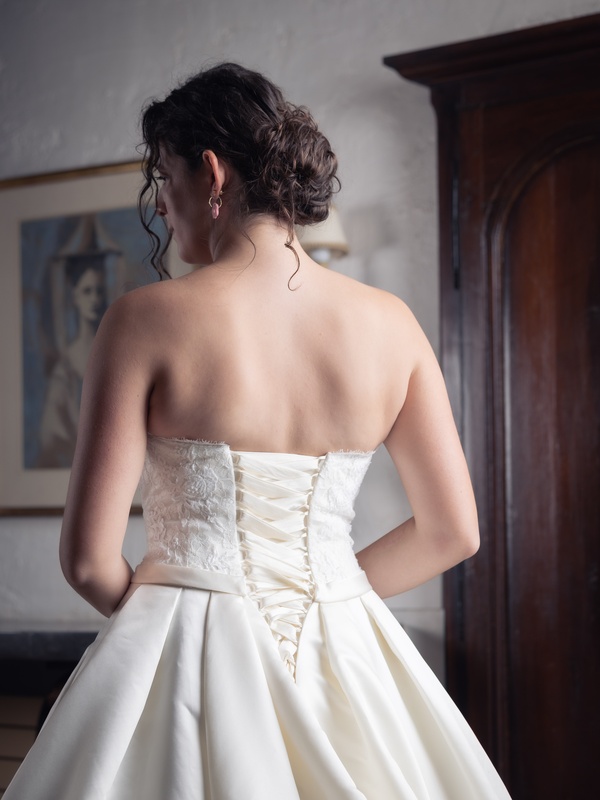 Romane est une robe bustier, avec une jupe en satin dotée d’une traîne de taille moyenne. Son bustier est en effet dentelle, non transparent.