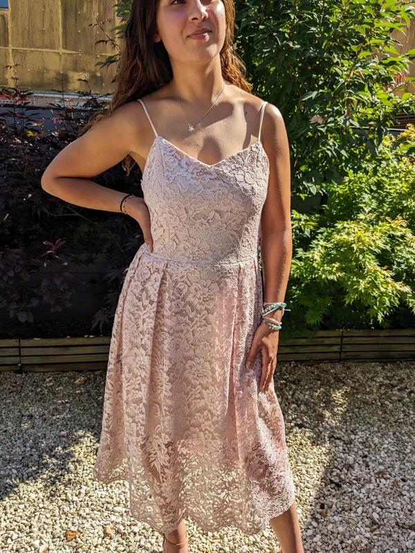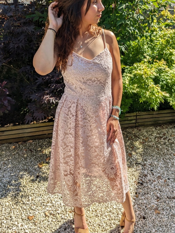 Petite robe rose, effet dentelle, à bretelles. Bustier ajusté, légèrement stretch pour plus de confort, jupe évasée.