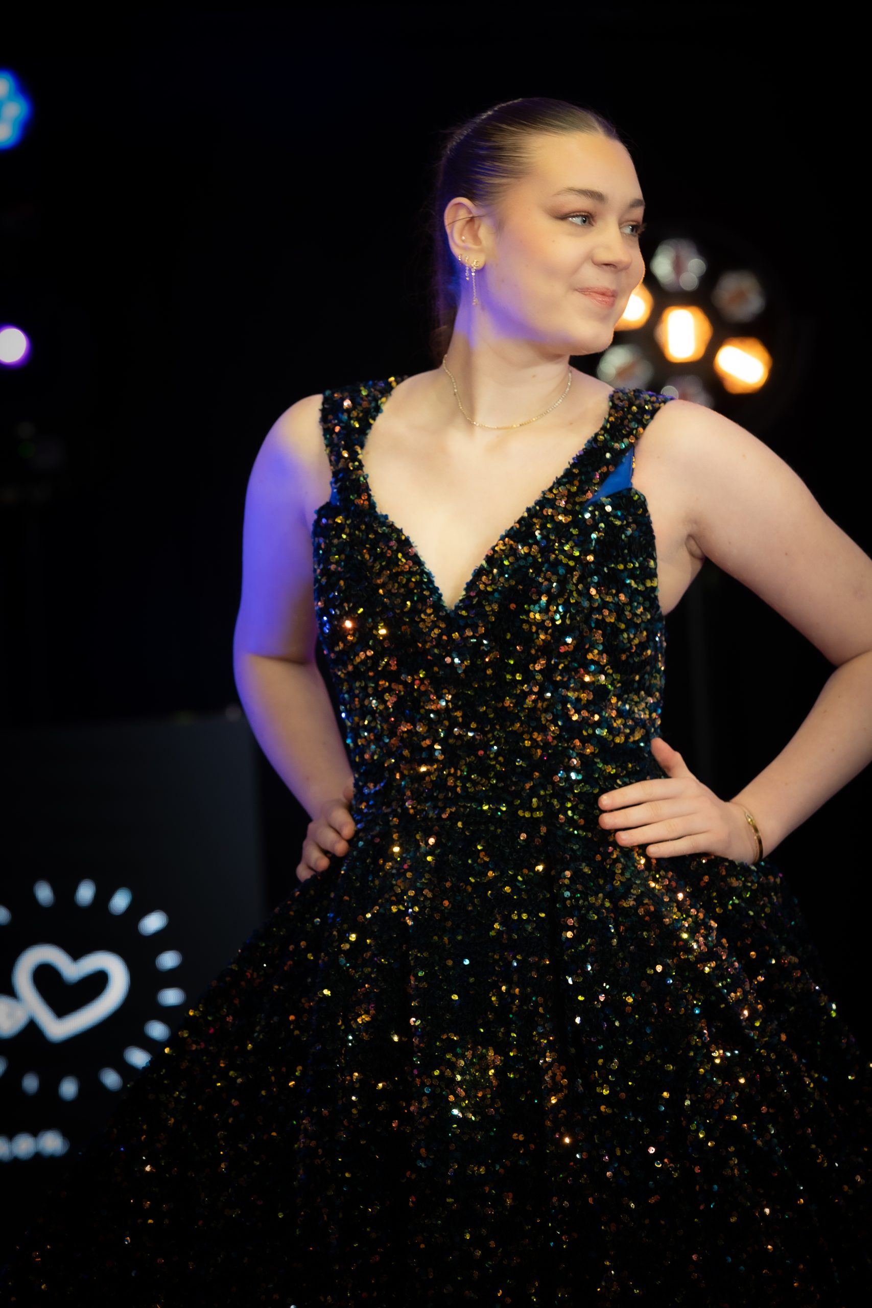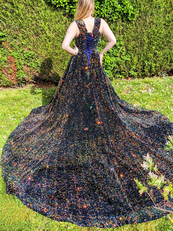 Robe à sequins, col en V, doublure en viscose et polyester.